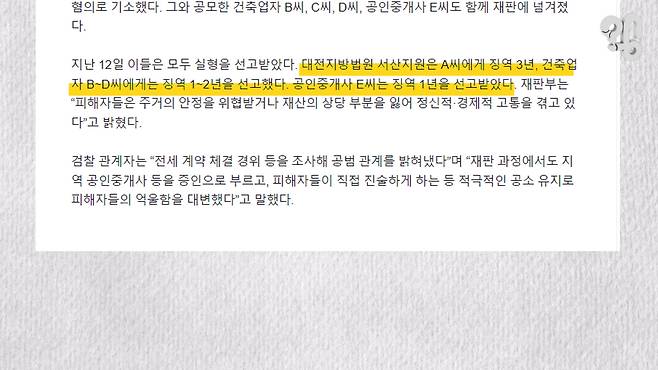 다른 것도 마찬가지겠지만 특히 전세 사기에 대해선 처벌이 관대한 점도 문제로 지적된다. 이건 지난 7월 전세 사기를 벌인 일당에 대한 법원 재판 결과인데, 세입자 9명의 전세보증금 6억원을 날려먹은 전세 사기 일당에게 내려진 형벌은 고작 징역 1년~3년에 그쳤다. 피해자들은 힘겹게 모은 목돈을 날려 힘들어하는데 사기에 가담한 가해자는 고작 감방 1년 살고 자유의 몸이 되는 거다.