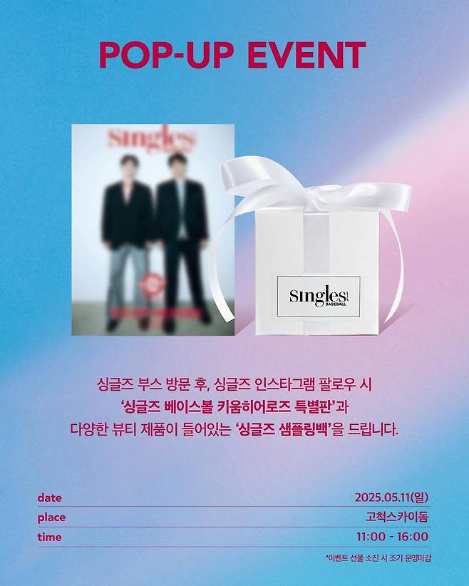 고척 스카이돔 싱글즈 부스에서 이벤트에 참여하면 '싱글즈 키움 히어로즈 특별판'과 함께 다양한 뷰티 제품을 경험해 볼 수 있는 싱글즈 샘플링 백을 드립니다.