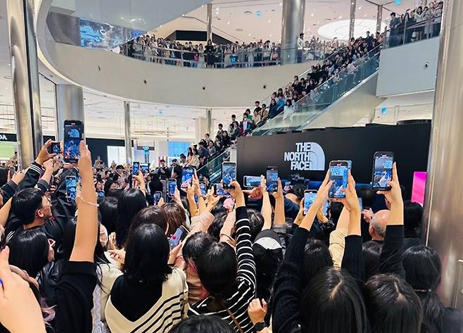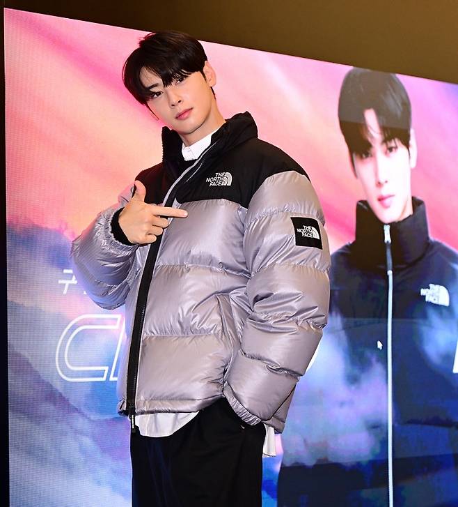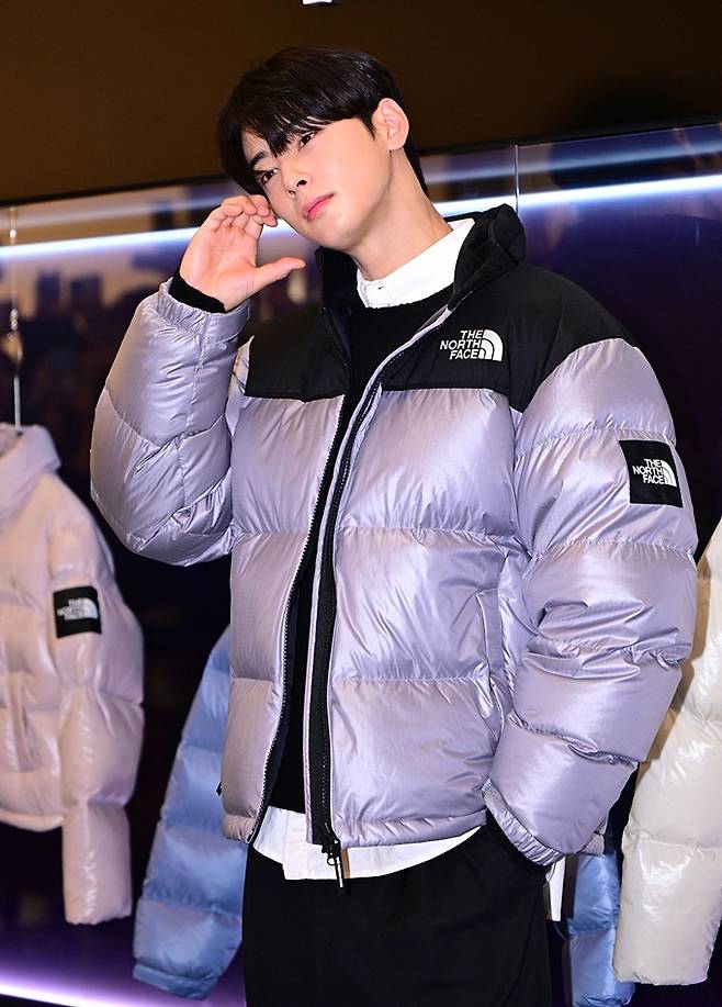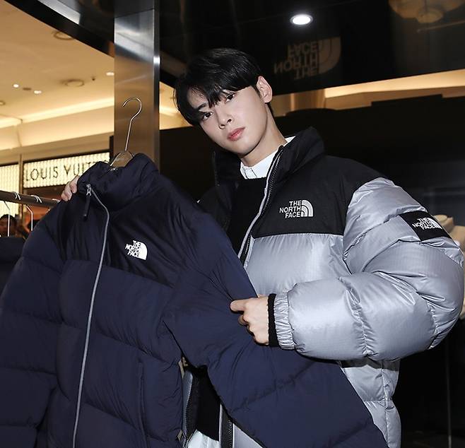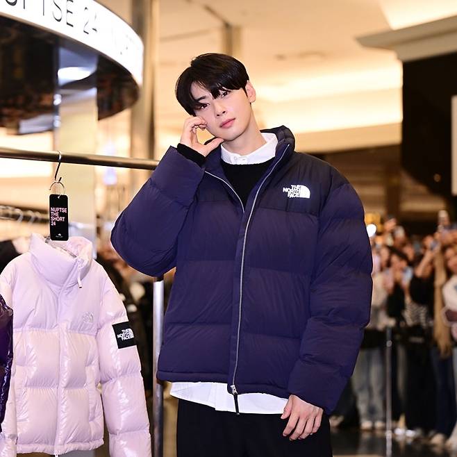 차은우는 25일 부산 신세계백화점 센텀시티점에서 열린 글로벌 아웃도어 브랜드 노스페이스의 눕시 24(NUPTSE24) 팝업스토어 오픈 행사에 참석했다.
