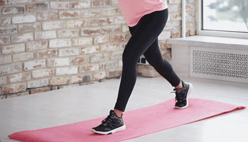 매트에 서서 준비 자세를 취합니다. 왼쪽 다리를 앞으로 뻗으며 무릎을 90도로 구부려 런지 동작을 반복합니다. 이번에는 오른쪽 다리로 운동하세요.
