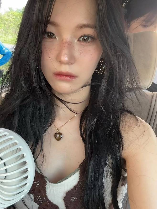 포인트는 무엇보다도 그녀의 페이크 프렉클 메이크업이다. 자연스럽게 뿌려진 듯한 주근깨는 동화 속 주인공을 연상시키며, 소녀와 여인의 경계를 아슬하게 넘나드는 분위기를 완성한다. 이는 최근 MZ세대 사이에서 유행처럼 번지고 있는 ‘서머 프렉클’ 트렌드의 대표적인 예로, 메이크업 하나만으로도 스타일에 강렬한 스토리를 부여하는 기법이다.