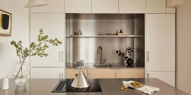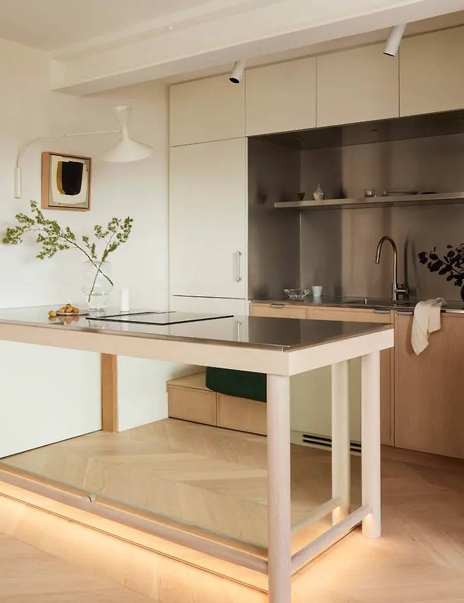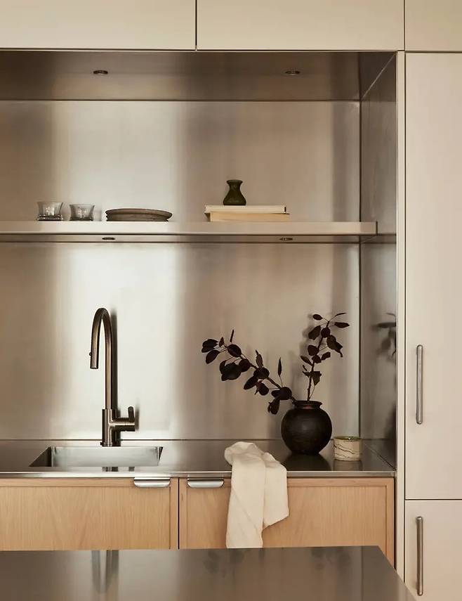 스테인리스 스틸 주방은 빛을 반사해 공간을 넓어 보이게 합니다. 한쪽 벽을 수납가구로 채워 수납력은 극대화하고, 중앙은 오픈 선반을 둬 시각적 여유를 확보했죠. 아일랜드 하단 간접조명은 차가운 금속 질감을 부드럽게 중화시켜 분위기를 살립니다. 자연채광이 반사되면서 주방 전체가 밝아지고 개방감이 배가됩니다.