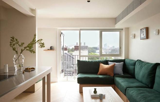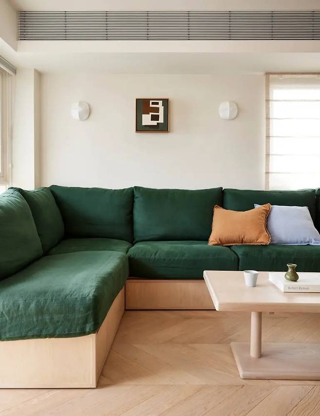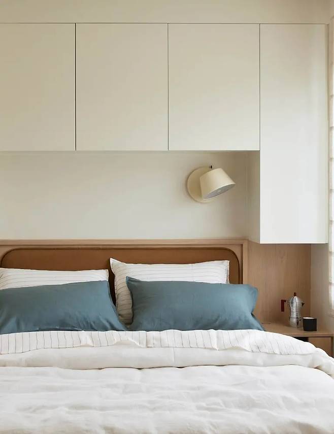 거실의 코너형 소파는 많은 손님을 수용하고, 내부 수납공간이 있어 생활용품을 깔끔하게 보관합니다. 침실은 헤드·베이스 일체형 캐비닛과 수납침대로 효율성을 높였습니다. 벽면과 상부장은 화이트 컬러로 시각적 무게를 줄여 작아 보이지 않게 하고, 공간마다 수납을 숨겨둬 생활 동선이 편리해집니다.