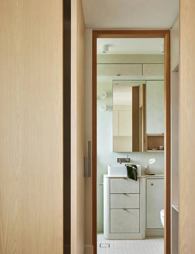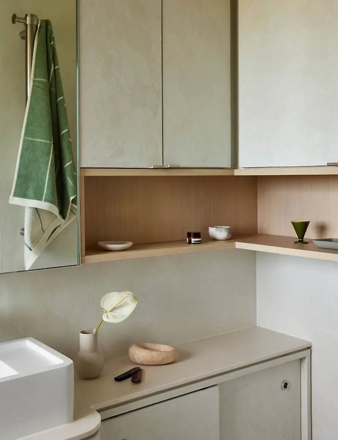 욕실 수납도 전략이 필요합니다. 세면대 하부장은 서랍형으로 물건을 쉽게 꺼내고, 욕실장은 도어와 오픈 선반을 혼합해 실용성과 장식을 모두 챙겼습니다. 타올, 욕실용품 등 부피 있는 물건을 깔끔하게 정리하면서 디퓨저나 장식품을 배치해 공간의 미적 완성도를 높였습니다. 작은 욕실도 계획적인 수납으로 쾌적하게 유지할 수 있습니다.