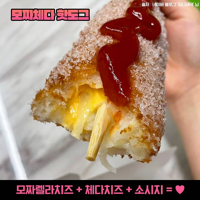 치즈 덕후들이라면 명랑핫도그에서 꼭 먹는다는 메뉴! 모짜렐라치즈와 체다 치즈가 들어간 핫도그예요. 부드럽고 진한 2가지의 치즈 맛이 아주 고소하게 느껴진다구요~