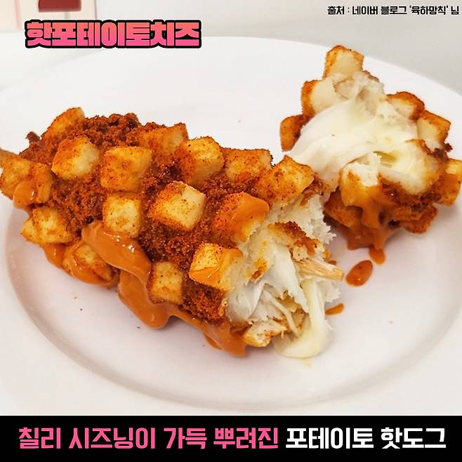 깍둑 썰기된 네모난 감자가 핫도그 위에 송송 붙어있는 감자 핫도그! 그 안에 모짜렐라가 통으로 들어가 있다면..? 그야말로 맛없없 조합이죠.