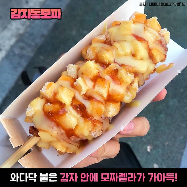 깍둑 썰기된 네모난 감자가 핫도그 위에 송송 붙어있는 감자 핫도그! 그 안에 모짜렐라가 통으로 들어가 있다면..? 그야말로 맛없없 조합이죠.