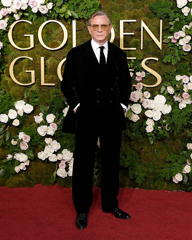 영화 <퀴어>로 드라마 영화 부문 남우주연상 후보에 오른 배우 다니엘 크레이그는 조르지오 아르마니의 블랙 벨벳 투버튼 노치 칼라 재킷과 베스트와 팬츠, 화이트 이브닝 셔츠, 그리고 넥타이를 착용했다. 어느새 백발에 가까워지고 있는 다니엘에게 벨벳 소재는 그의 중후한 매력을 한층 고급스럽게 격상시키는 똑똑한(?) 장치였다.