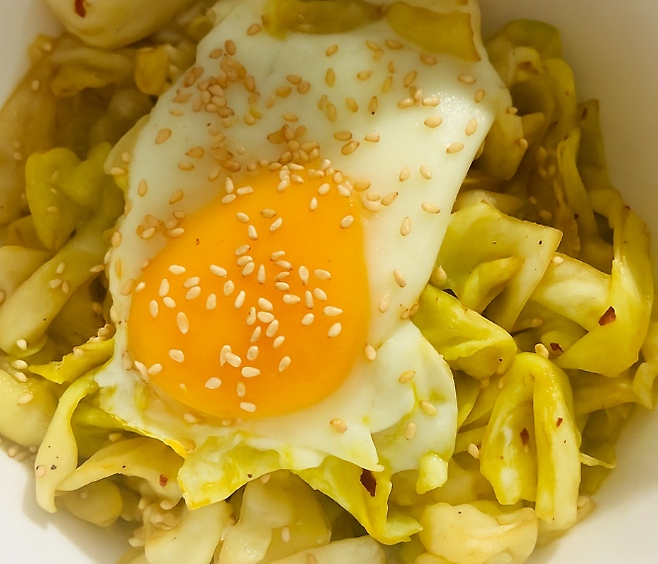따뜻한 밥 위에 양배추무침을 올리고계란프라이 하나 올리면 속편한 한 끼 완성!