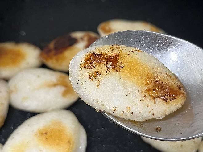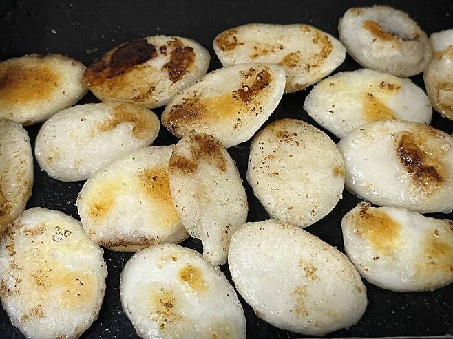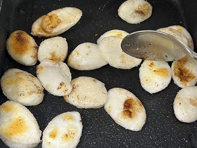 불이 세면 떡이 쉽게 타므로 반드시 약불로 조리하세요. 한쪽 면이 익었으면 뒤집어서 반대쪽도 노릇하게 굽습니다. 이대로만 먹어도 맛있습니다.