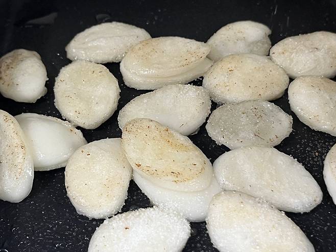 식용유를 두른 팬에 떡을 약불로 굽습니다. 떡을 식용유에 구우면 떡꼬치의 떡처럼 바삭한 식감이 됩니다.
