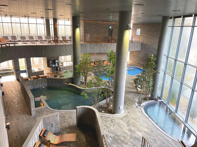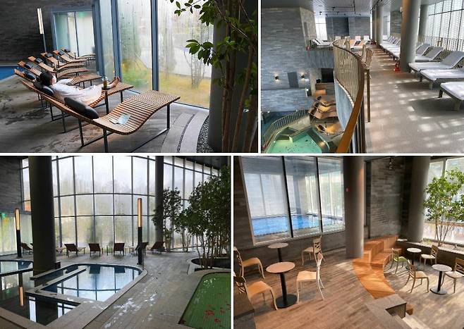 SNS를 뜨겁게 달군 주인공, 1~2층에 자리한 하이디스파부터 살펴봤다. 첫인상은 넓고 쾌적했다. 탁 트이는 통창 뷰가 가장 시선을 붙든다. 단풍 곱게 핀 가을 풍경은 물론, 겨울의 눈비 내리는 날 습기 찬 모습도 나름의 운치가 있다. 허브탕, 라벤더탕, 노천탕, 미네랄탕 등 12가지 테마의 욕탕과 5가지 사우나가 실내외에 걸쳐 다채롭게 구성돼 있다. 통창 바로 앞이나 탕 중간중간 비치체어도 넉넉히 있어 밖의 풍경을 감상하며 휴식하기 좋다. 전체적으로 조명이 어두운 편이라 인증 사진이 주목적이라면 약간의 아쉬움은 있겠지만, 눈이 피로하지 않아 힐링 만족도는 높을 것으로 보인다. 카페에서 구입한 음료를 마실 수 있도록 테이블도 여럿 비치돼 있다.