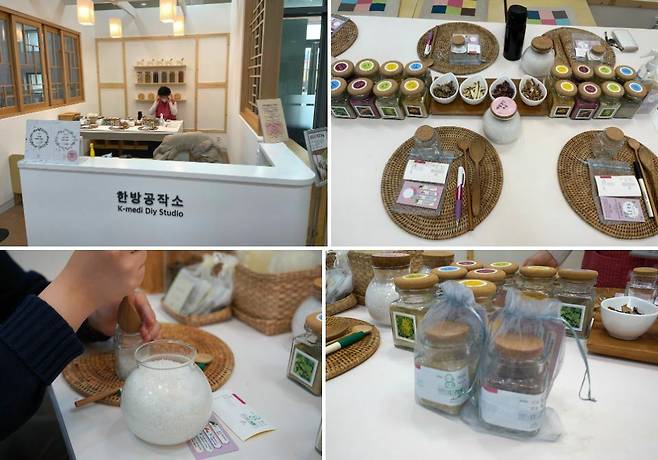 전시 관람을 마치고 한방공작소를 찾아 나만의 족욕 소금 만들기 체험에 참여해봤다. 살균효과, 각질제거, 습진 완화, 피부미용 등 자신이 원하는 효능에 따라 어성초, 진피, 감초, 백년초 중 두 가지를 골라 소금과 함께 섞는다. 만들기 쉽고 집에서 족욕할 때 간편하게 사용할 수 있어 기념품으로 만들어보는 걸 추천한다.