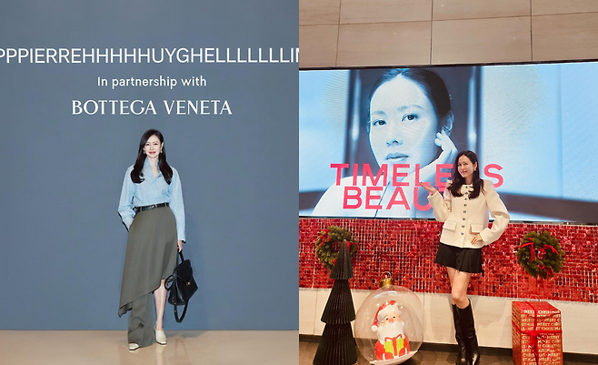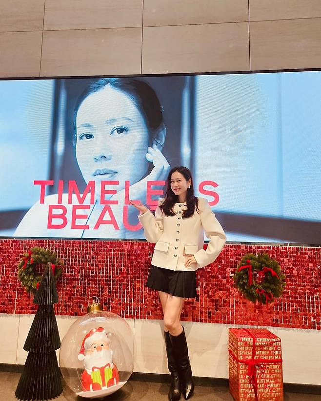 화이트 재킷과 블랙 미니스커트, 롱부츠를 착용한 손예진은 단정하면서도 우아한 크리스마스룩을 완성하고 있다. 깔끔한 버튼 디테일과 미니멀한 액세서리가 세련된 이미지를 강조하며, 배경의 레드 컬러와 조화를 이룬다