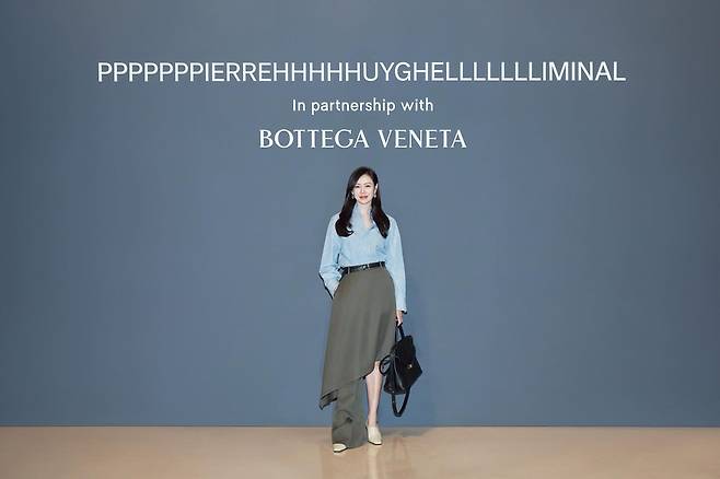 손예진은 보테가 베네타 행사장에서 하늘색 셔츠와 카키색 비대칭 스커트를 매치해 세련된 모던 클래식 룩을 연출하고 있다. 블랙 벨트와 백, 베이지 톤 슈즈로 전체적인 톤을 정제했으며, 미니멀한 스타일링이 브랜드의 고급스러움과 잘 어우러진다