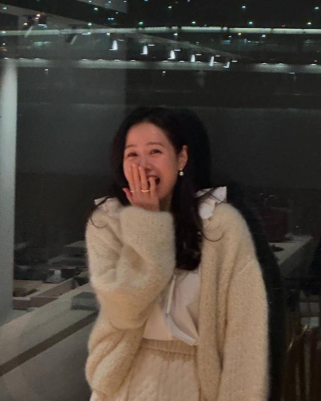 손예진은 크림 컬러의 니트 가디건과 팬츠, 그리고 후드 상의를 매치해 포근하고 내추럴한 데일리룩을 선보이고 있다. 자연스럽게 흐르는 헤어스타일과 미소가 어우러져 편안하면서도 세련된 분위기를 자아낸다
