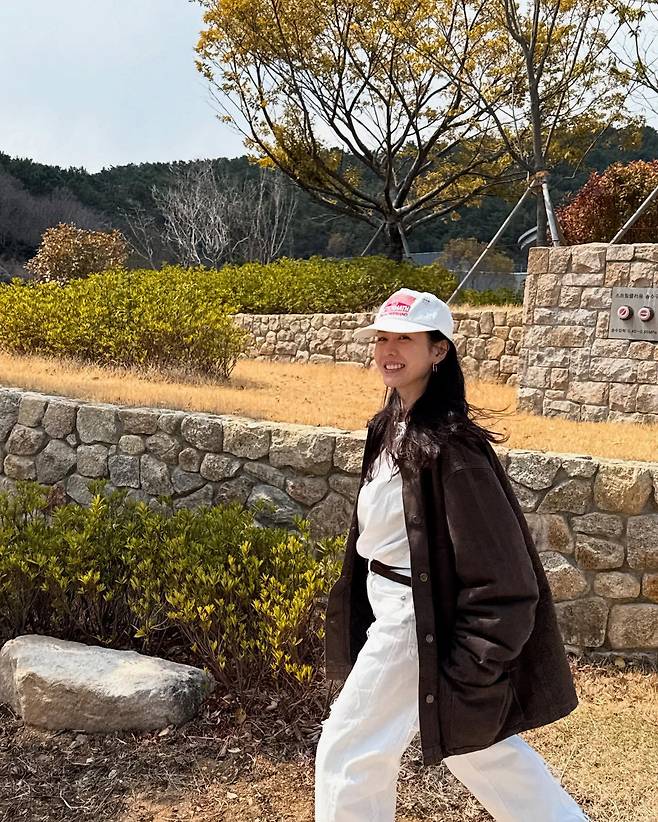 화이트 톤의 티셔츠와 팬츠, 그리고 브라운 컬러 셔츠 재킷을 매치한 손예진은 야외에서 산뜻한 아웃도어 캐주얼룩을 연출하고 있다. 화이트 볼캡과 심플한 스타일링이 자연과 어우러져 건강하고 자유로운 이미지를 부각한다