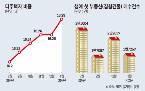 생애 첫 주택 매수 감소세는 2020~2021년 저금리 기간 폭발적으로 늘어난 2030세대의 패닉바잉(공황매수)으로 비정상적으로 늘었던 첫 집 매수가 줄었고, 반면 다주택자 세제 완화로 상대적으로 자금력이 더 큰 다주택자의 주택 매입은 꾸준히 이어진 것이다.