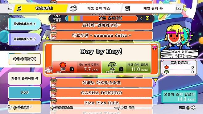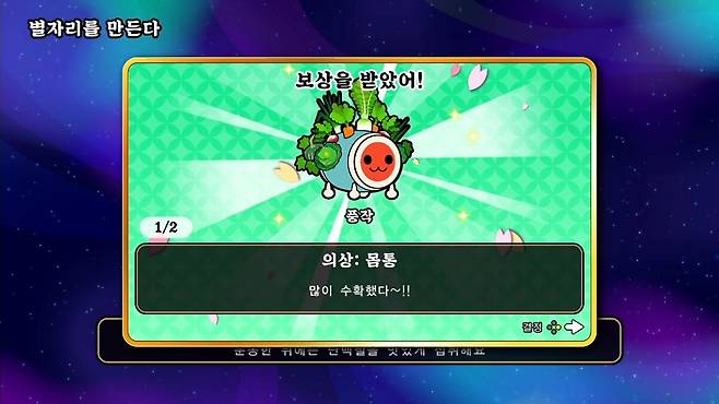 이외에도 두구둥 피트니스의 좋은 점은, 게임을 클리어했을 때 별도의 포인트가 쌓여 새로운 의상이나 칭호 등 특전을 제공해 동기를 부여한다는 겁니다. 태고의 달인 쿵딱! 원더풀 페스티벌을 출시 시점부터 즐긴 플레이어라면 이미 배틀 패스 개념의 '태고 레벨'을 모두 완성해 플레이 동기가 부족했을 텐데, 올겨울에는 두구둥 피트니스로 특전을 채워가며 운동 효과를 노려보는 것도 좋겠습니다.