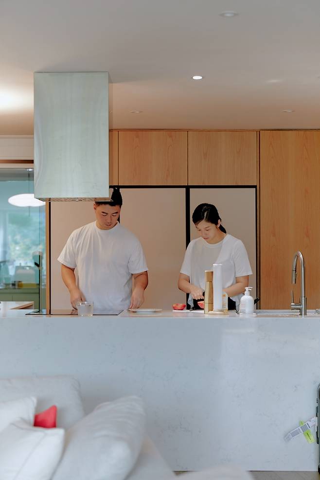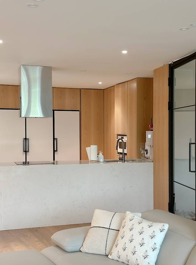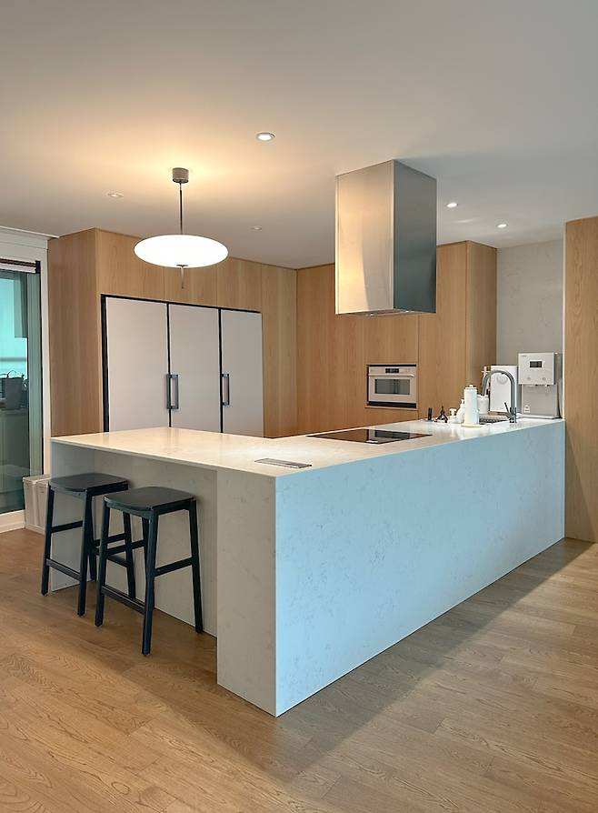 그래서 주방과 거실이 공간은 구분되어 있되 한 공간처럼 느껴질 수 있도록, 대면형 주방으로 설계해 보았어요. 대면형으로 설계를 하고 나니, 주방에서 집 앞 경치는 물론 거실에 있는 아이들을 살피면서 일을 할 수 있어 굉장히 실용적인 것 같아요.