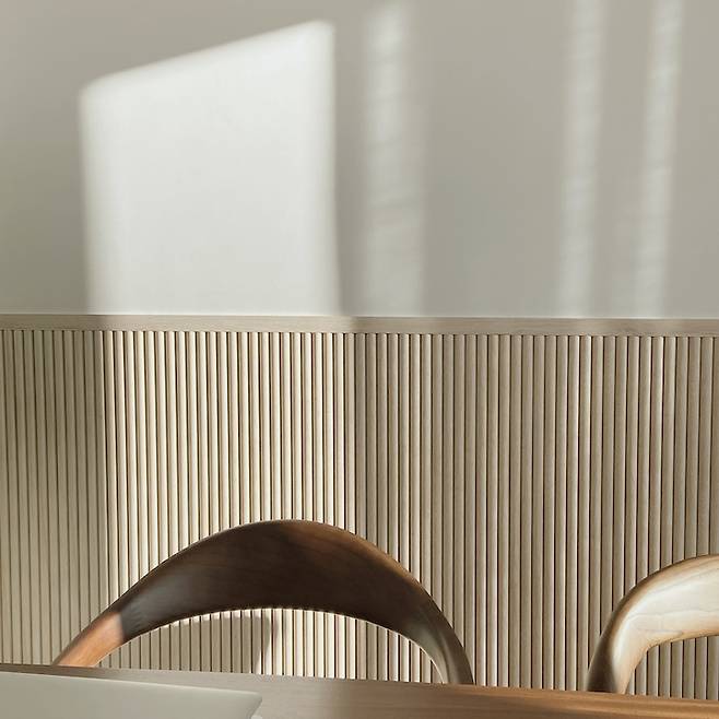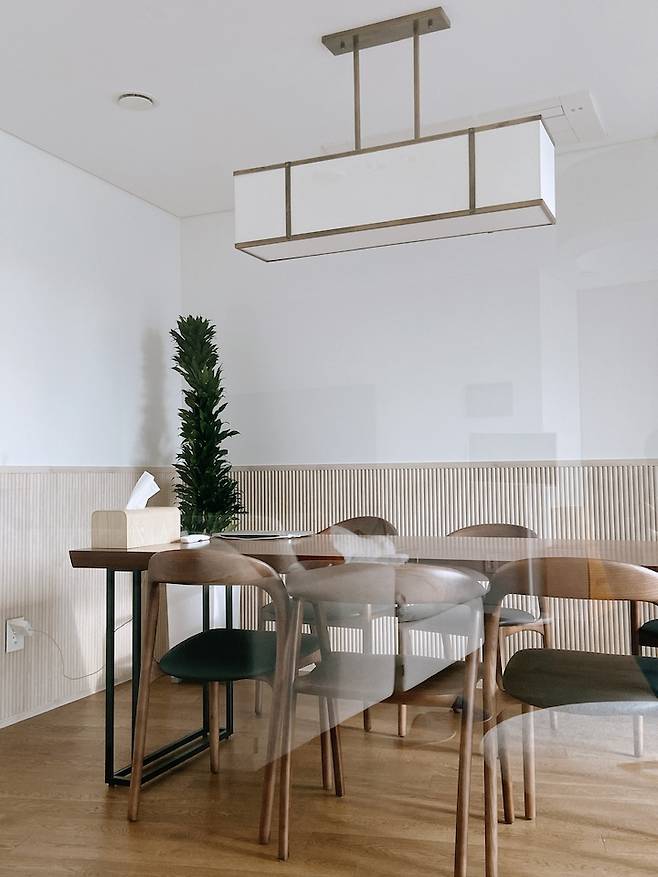 깔끔함을 원해서 다이닝룸에는 테이블과 의자를 제외하곤 아무것도 두지 않으려고 했는데, 자칫 밋밋해 보일까 싶어 템바 보드를 짜 넣었어요. 우드 색상이 달라서 어색해 보일까 걱정도 했었는데, 해놓고 나니 만족스러운 부분 중에 하나예요.