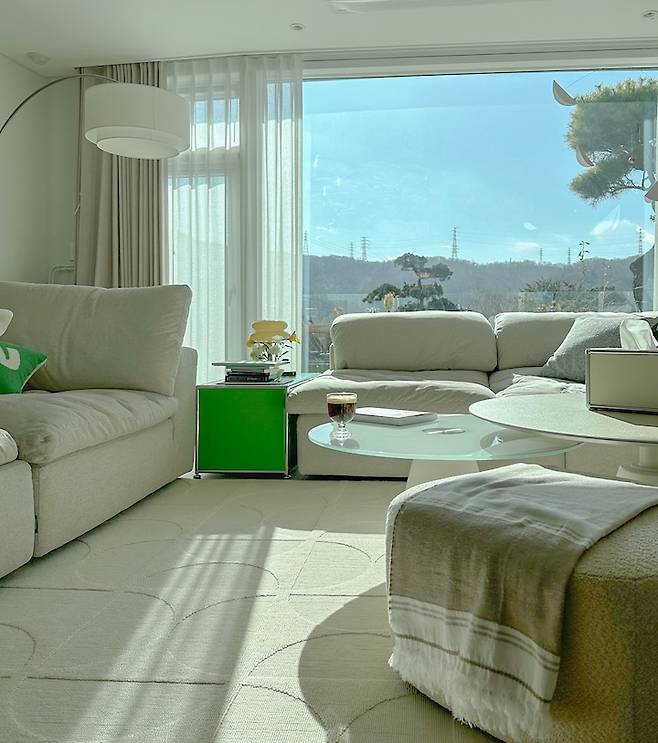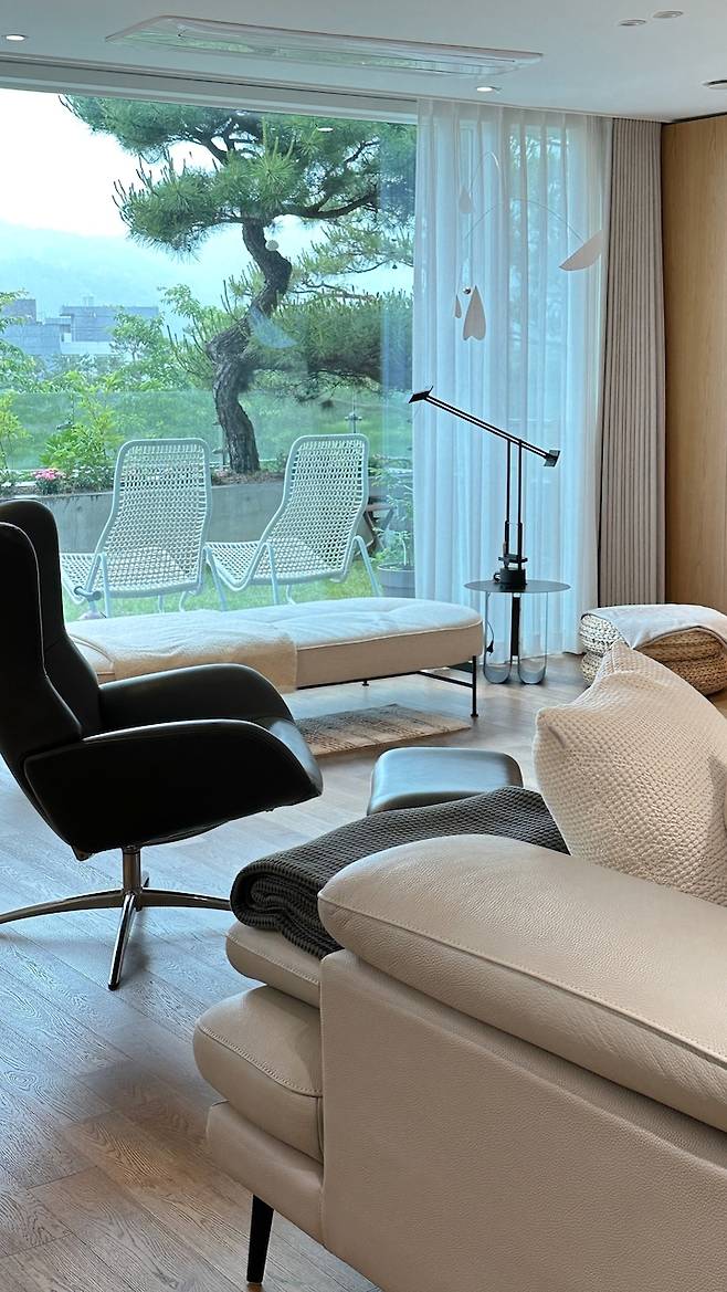 그래서 창밖으로 보이는 뷰에는 전경을 가로막는 높은 건물 없이 청명한 산이 한눈에 들어와요. 거실의 큰 창이 테라스와 맞닿아 있어서, 전원주택처럼 실내에서 자연을 감상할 수 있다는 매력이 있어요.