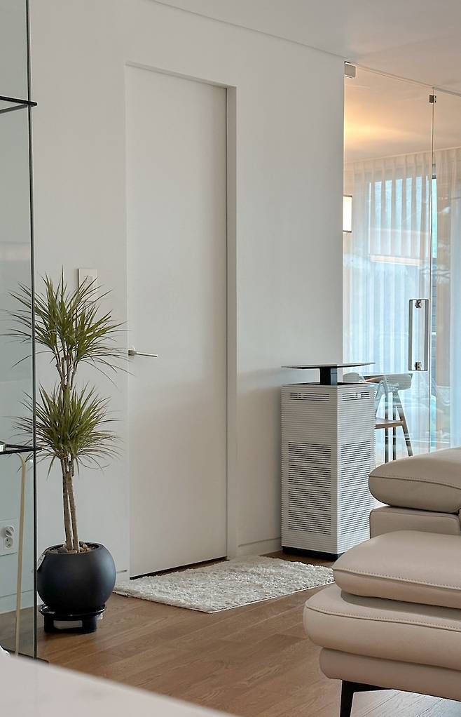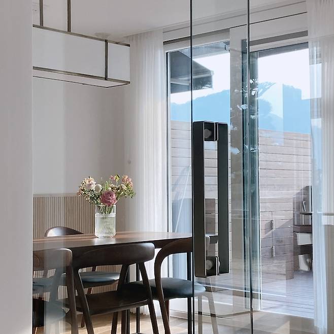 아무래도 바깥 문을 열면 바로 테라스와 연결되어 있고, 통 유리창을 통해 거실 공간도 훤히 잘 보이니 답답한 느낌 없이 공간을 이용할 수 있기 때문인 것 같아요.