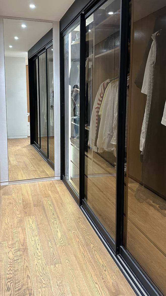 드레스룸 한 쪽 벽면에 자주 입는 옷을 보관하기 위한 스마트 행거와 원목의 수납장을 짜고, 그 앞에 유리 미닫이문을 설치하여서 자칫 지저분해 보일 수 있는 옷장을 조금은 가려내어 깔끔한 느낌을 내보았어요.