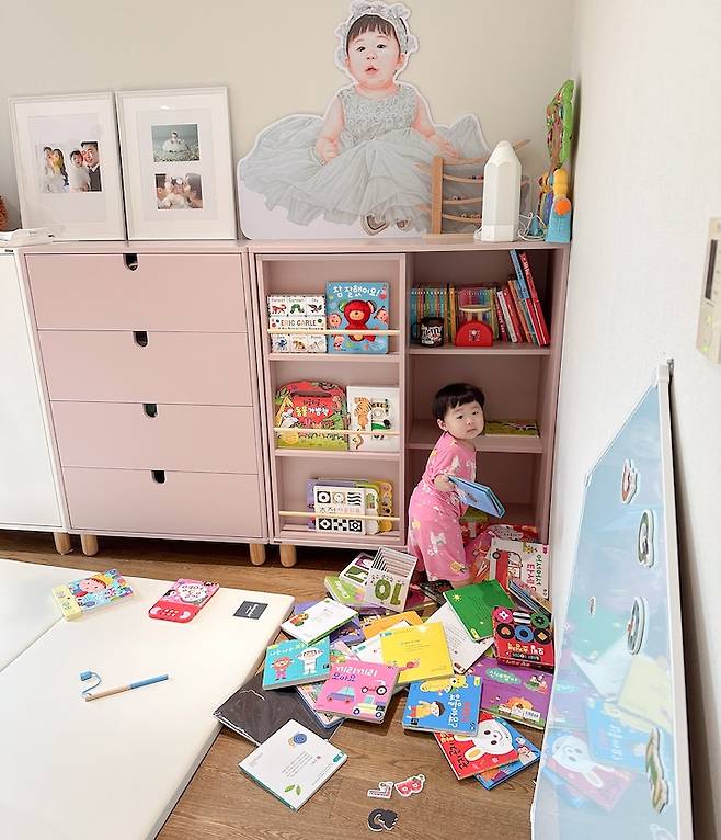 벽 한쪽에는 이렇게 아이를 위한 파스텔 핑크 톤의 예쁜 수납장을 두었어요. 아이 옷은 부피가 크지 않다 보니 그렇게 크지 않은 사이즈의 수납장으로도 충분히 계절 옷 커버가 되더라고요! 그리고 아이 책과 장난감도 함께 정리할 수 있는 수납장이라, 정말 유용하게 잘 사용하고 있답니다.