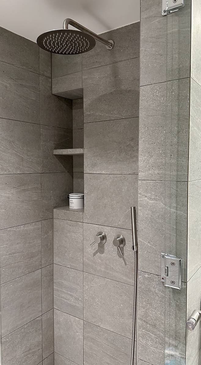 샤워부스 내에도 마찬가지로 매립형 선반을 설치했어요. 처음 공사 때, 매립형 선반으로 설치해 달라는 요청이 누락되었더라고요. 그래서 재공사를 외치며 저 부분만큼은 꼭 사수를 했어요. 그 결과 너무 만족해요!
