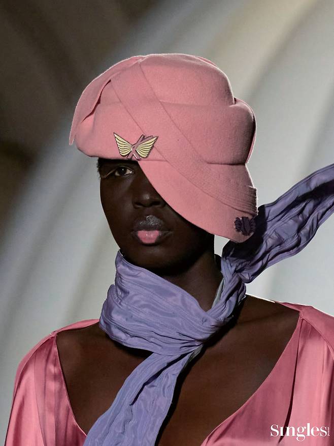 이제 그러데이션이나 풀립으로 입술 메이크업을 하는 데 따분해진 것일까? 이번 2025 S/S 컬렉션에서는 입술에 그림을 그린 것 같은 룩이 돋보였다. 키코 코스타디노브는 입술과 확실한 대비를 줄 수 있는 브라이트한 핑크 컬러를 아랫입술 중앙에만 발라 포인트를 주었다.