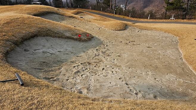 다행히도 벙커샷을 한 번도 하지 않았어요. 발자국 관리는 잘 안되는 거 같더라고요. 단단함 정도는 모르겠습니다만 색깔로 보아 부드러운 모래입자는 아닌 거 같습니다.