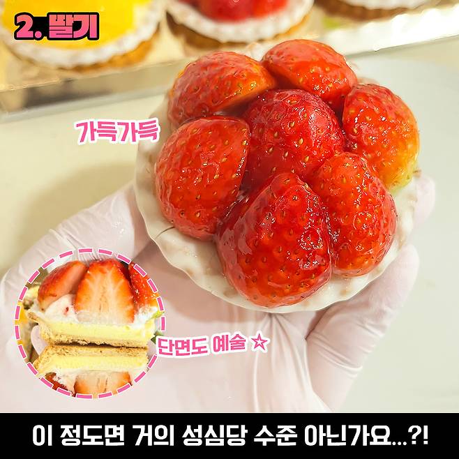 딸기 타르트도 예외는 아니에요. 그냥 먹어도 한 입 가득 찰 것 같은 오동통한 딸기들이 발 디딜 틈 없이 꽉 올라 타있답니다. 딸기가 너무 무거워서 타르트가 부서질 까봐 엄청 조마조마하더라구요. 이 정도면 거의 성심당 수준 아닌가요…?!