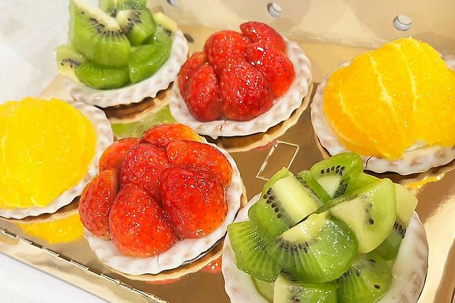 혜자로운 생과일 아래에 깔려 있는 치즈층이 보이시나요? 치즈를 슬쩍 바른 수준이 아니라 타르트 과자 두께보다 더 두툼하게 깔려 있더라구요. 매번 맛있게 먹기만 했지 반으로 갈라본 건 처음인데 또 한 번 더 반한 것 같아요.