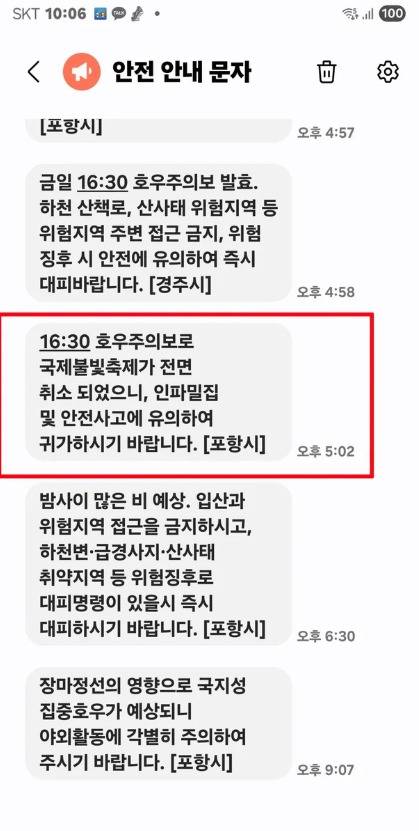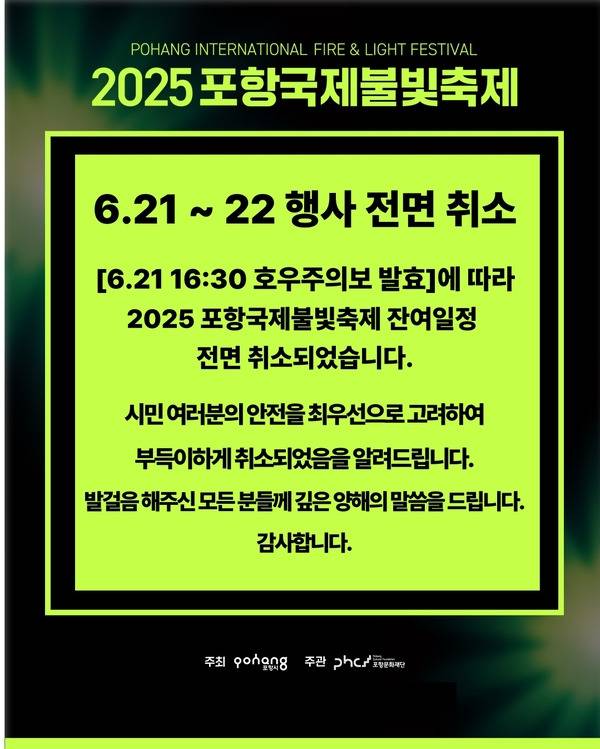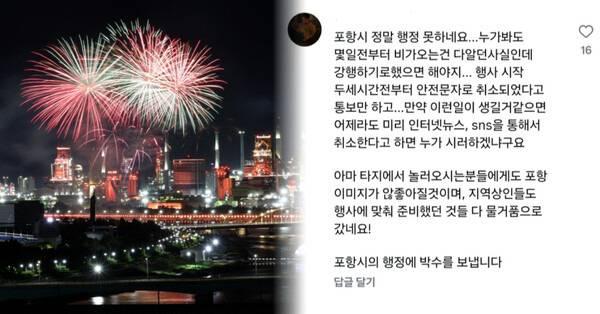 이에 전국 각지에서 포항을 찾은 방문객들은 “기상 상황은 며칠 전부터 예보됐는데 왜 하루 전도 아닌 당일에 취소를 통보했느냐”며 불만을 표했으며 일부는 “이건 축제가 아니라 사기”라며 강하게 비판했습니다.