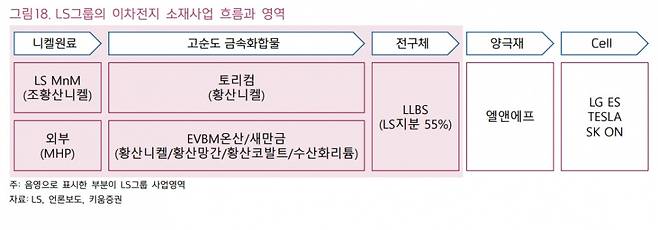 여기에 LS MnM이 지난해 10월부터 온산제련소 인근에 2.9만평 규모 이차전지 소재 복합 공장인 ‘EVBM온산’ 착공에 들어갔다. EVBM온산은 전구체의 핵심 소재인 황산니켈, 황산코발트, 황산망간 뿐만 아니라 양극재 소재인 수산화리튬까지 종합적으로 생산하는 공장을 목표로 하고 있다. 지주사 LS가 양극재 회사인 엘앤에프(L&F)와 합작해 'LS-엘앤에프 배터리솔루션(LLBS)'을 설립한 가운데 LLBS 공장까지 가동을 시작하면 조황산니켈(LS MnM) → 황산니켈(토리컴,EVBM온산/) → 전구체(LLBS) → 양극재(엘앤에프)로 이어지는 수직계열화가 완성되어 공정별로 시너지효과에 따른 경쟁력 확보가 가능할 것이란 분석이다.