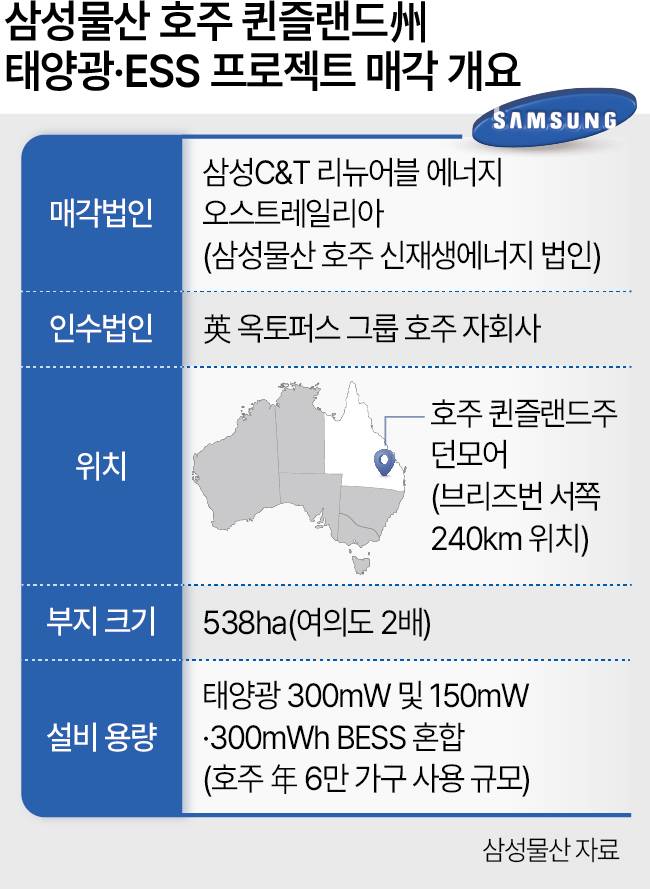 삼성물산이 호주에서 태양광·에너지저장장치(ESS) 발전 사업권을 영국계 회사에 매각했다.