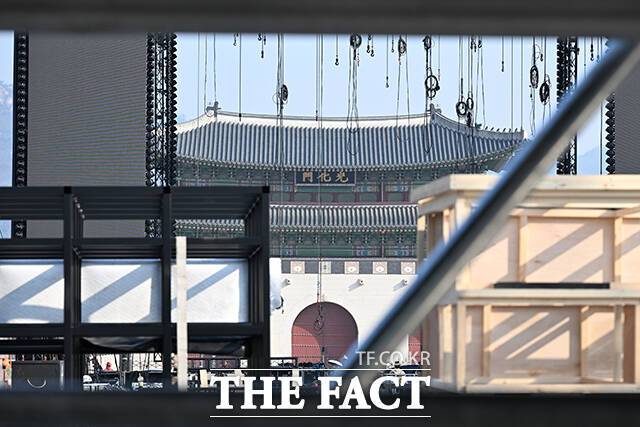 [더팩트 | 김성렬 기자] 그룹 방탄소년단(BTS)의 광화문 콘서트를 나흘 앞둔 17일 오전 서울 종로구 광화문 앞으로 무대 설치가 진행되고 있다.