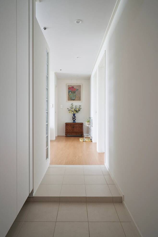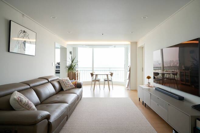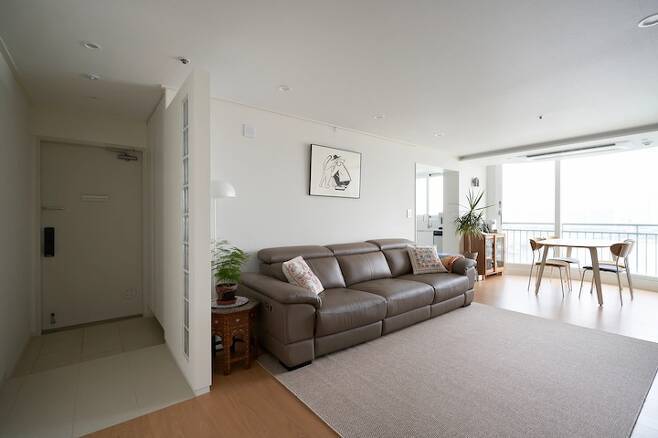 가벽 맞은편에서 본 뷰에요. 손님들이 집에 들어올 때 가벽이 있으니 바로 마주하지 않아 저는 좋더라고요! 가벽 길이도 저희가 구매한 소파 사이즈에 맞추어 제작했습니다. 원래는 가벽을 천장까지 맞춰서 하려고 했는데, 딱 그 자리에 스프링클러가 있어서 어쩔 수 없이 천장과 가벽 사이에 간격이 생겼어요. 그래도 막상 보니 나름 입체감 생기고 좋은 것 같아요.