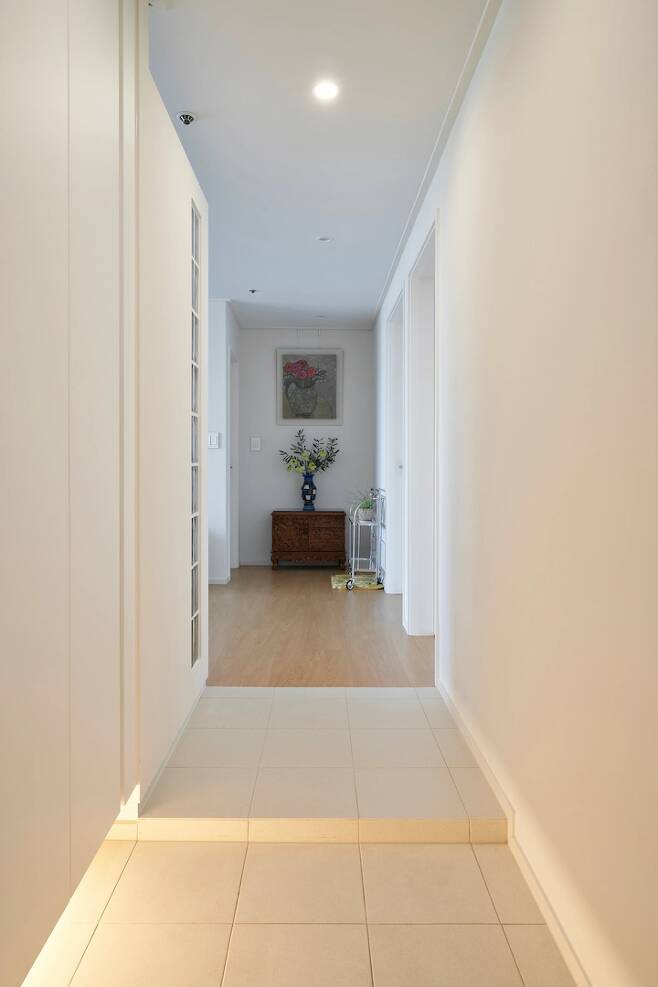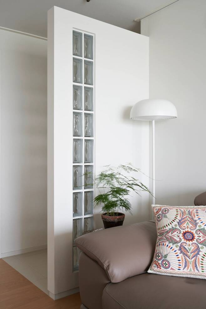먼저 저희 집에 들어오면 제일 먼저 보이는 현관입니다. 인테리어 하기 전에는 중문이 있었는데 사실 저는 중문이 거추장스럽기도 하고, 작은 현관이 더 작게 느껴지더라고요. 그래서 인테리어 사장님과 상의 후에 옆에 가벽을 세워 좀 더 확장된 느낌으로 했습니다. 덕분에 현관에서 답답함이 없어졌어요! 신발장 밑엔 간접등을, 가벽엔 요즘 핫한 유리블록도 넣어주었어요~