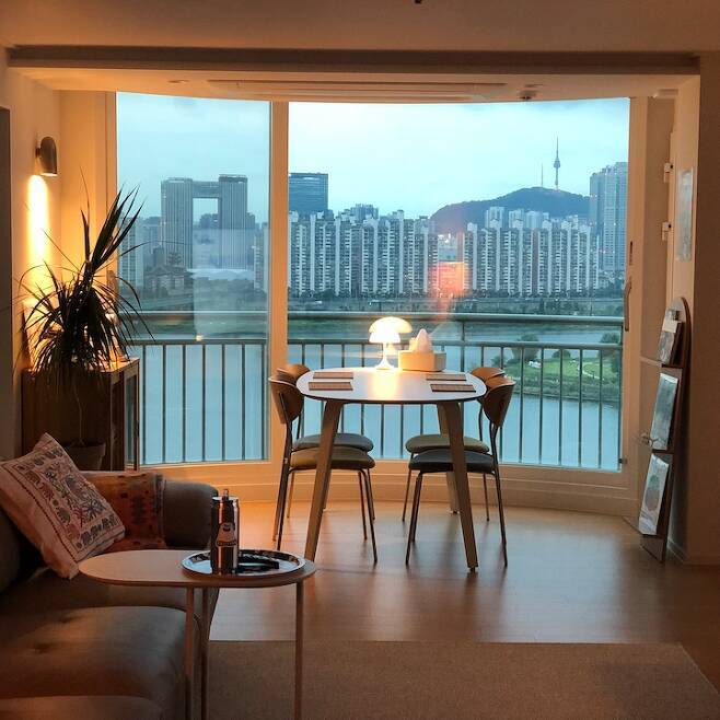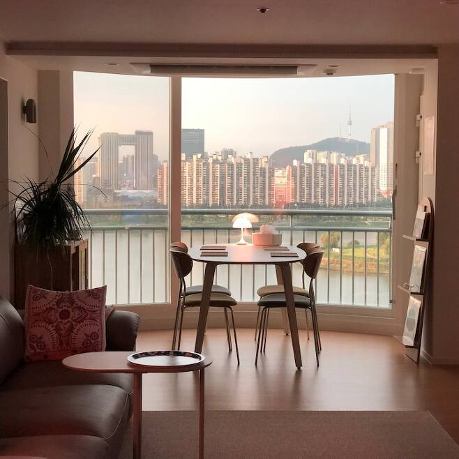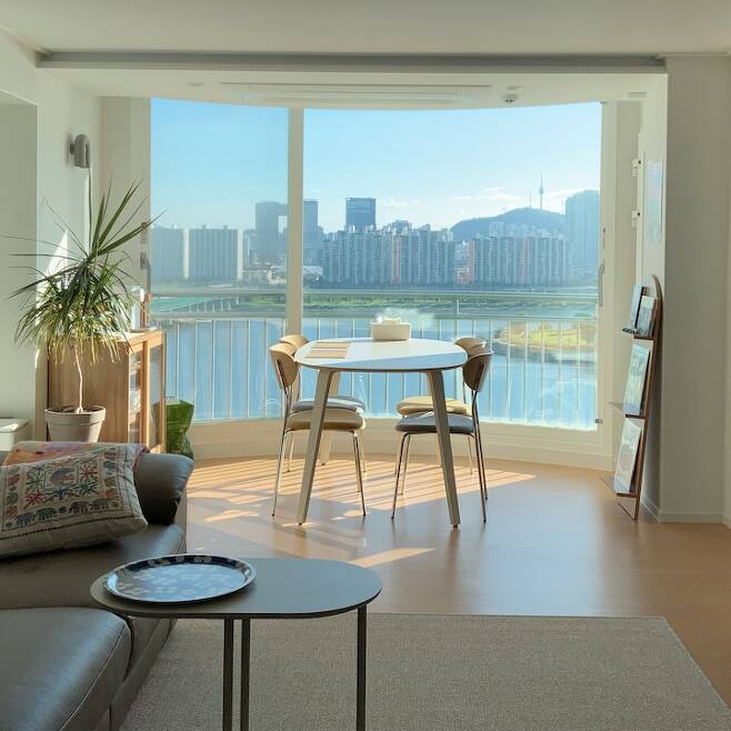 주방 벽 쪽에는 그릇장을 두고 그 위에 집들이 선물로 받은 커피 머신을 두었어요. 커피 내리고 식탁에 앉아 창밖 한강을 바라보는 시간을 제일 좋아합니다. :-) 손님들이 와도 다들 이 공간에만 있다가 가게 되는 것 같아요 ㅎㅎ 리클라이너 소파이다 보니 거실 테이블 따로 두기가 애매해서 사이드 테이블을 두었어요!