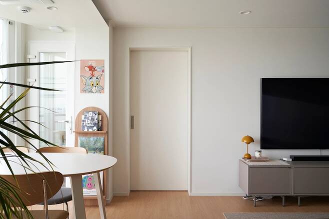 거실 앞쪽에는 히든 도어로 만든 드레스룸이에요! 저희 집 주방이 협소해서 김치냉장고도 넣어두었고, 에어 드레서와 시스템옷장을 설치해 두었어요. 왼쪽 작은 문은 베란다 공간이고 그 안쪽에 보일러가 있어요. 안 보이게 재활용 쓰레기 모아두는 곳으로 활용하고 있답니다.