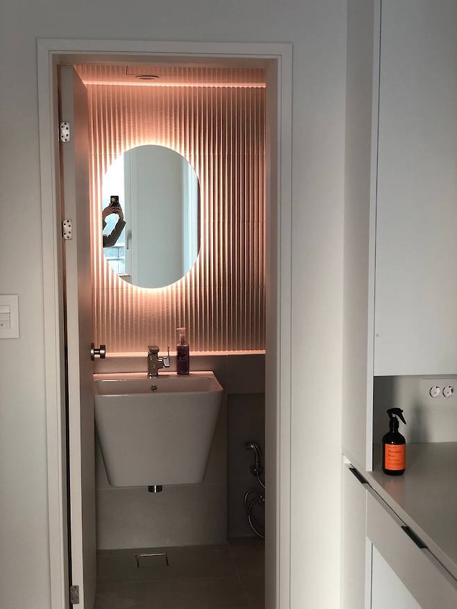 제 손이 빼꼼 나와버린 저희 집 안방 화장실 사진입니다. 안 보이는 오른쪽 공간 안에 변기가 위치해 있어요. 인테리어 준비 중에 우연히 윤현상재 입체 타일을 보고 너무 예뻐서 원래 시공 예정이었던 타일을 취소하고 교체했어요. 간접등 거울까지 설치하니 제가 원하던 분위기의 화장실이 되었네요! 참고로 저희는 화장실을 건식으로 쓰고 있습니다.