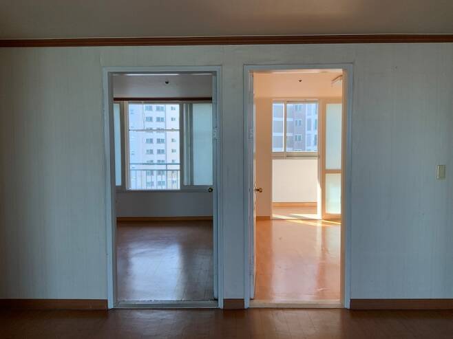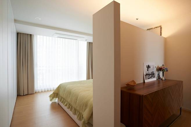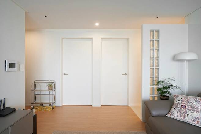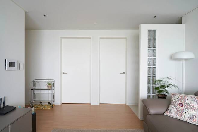 거실에서 창문을 등지고 바라보면 왼쪽 안방과 오른쪽 서재 방이 있습니다. 평소에는 모든 문을 다 열어놓고 생활합니다. 안방 같은 경우 가벽이 있어서 안에 침실이 바로 보이지 않아서 좋아요! :-)
