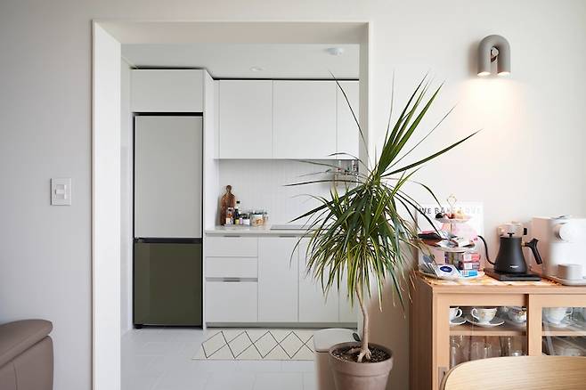 저희 집 주방 뷰에요! 원래 벽을 철거하고 대면형 부엌을 만들고 싶었으나 내력벽이어서 원래 구조대로 유지할 수밖에 없었어요. 모든 주변 분들이 식세기는 꼭 구입해야 한다고 해서 작은 주방에 많은 가전을 넣으려다 보니 인테리어 할 때 조금 고생이 많았네요. 그 덕에 냉장고 용량이 작아져 버렸지만 지금도 식세기는 참 잘 샀다고 생각합니다. ㅎㅎㅎㅎ