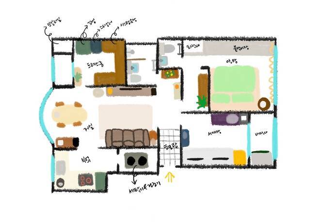 제가 끄적끄적 그려본 저희 집 평면도에요. ㅎㅎㅎ 구축이기도 하고 내력벽 문제로 구조 변경에는 많은 한계가 있었어요. 그렇지만 구조 자체가 일반적이지 않은 재밌는 구조였기에 안방과 거실만 확장해도 마음에 들었어요. 결혼 일정이 앞당겨지면서 급히 인테리어도 해야 했는데, 둘 다 회사원이라 거의 매일을 퇴근하고 시간 쪼개서 열심히 미팅도 하고 가구/가전 보러 돌아다닌 것 같아요. 그래도 시간이 제한적이었던 만큼 선택과 집중해서 잘 마무리할 수 있었네요!