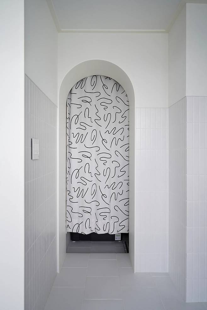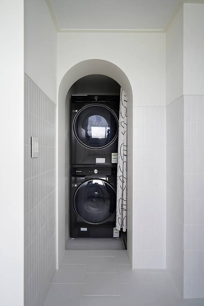주방 안쪽에 위치한 세탁실이에요. Before와 같이 원래는 문이 있었는데 공간이 협소한데 문까지 있으니 더 좁아 보이더라고요. 그리고 제 성격상 문이 있어도 늘 열어둘 것 같은 느낌? ㅎㅎㅎ 그래서 과감하게 문을 없애고 아치형 문틀을 만들었어요. 대신 세탁기가 바로 보이지 않게 커튼을 설치해두었답니다.