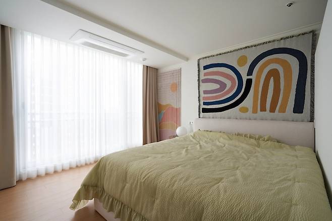 아침과 낮에는 안방으로 햇빛이 많이 들어와서 암막커튼을 설치했는데요. 어둡지 않게 베이지 톤으로 하니 암막 커튼이지만 밝은 분위기라 좋아요! 직접 와서 실측하고 진행할 수 있어서 그 부분도 너무 좋았습니다.