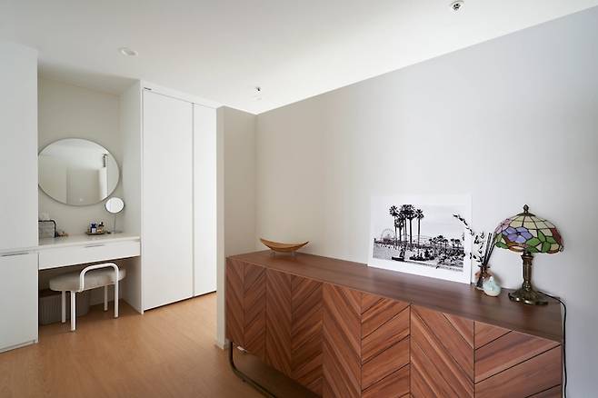 안방 문을 열면 보이는 공간입니다. 안방 베란다 확장으로 공간이 넓어져서 가벽을 세워 침대가 바로 보이지 않게 했고, 가벽 앞으로는 서랍장을 두어서 부족한 수납공간을 만들었어요. 붙박이장 옆에는 화장대를 설치했고 제가 화장품이 많아서 화장품 수납을 최대한 많이 할 수 있게 했어요. (거울 왼쪽에 보이는 공간이 모두 수납공간입니다.)
