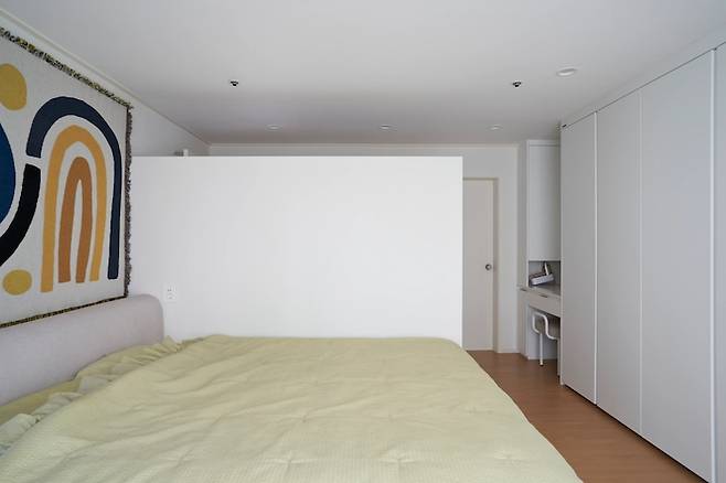 가벽 뒤쪽으로는 이렇게 침대가 숨어있고 가벽 위로는 간접 조명등을 설치했습니다. 원래는 잠들기 전 수면등으로 쓰려고 했는데 생각보다 빛이 밝아서 ㅎㅎ 평소 매립등 대신 켜는 등이 되었어요.